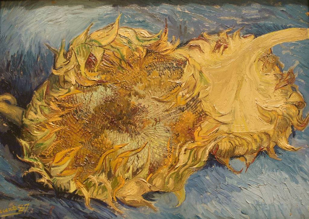 Sunflowers used to be a decoration and an allegory of enjoyment during the Baroque. Though, van Gogh’s flowers are not especially happy. Look at the Two Cut Sunflowers (third version). These flowers remind me of dryness and death, loneliness and sadness but not happiness. They are surrounded by a blue background. They are looking as if they fall into oblivion.