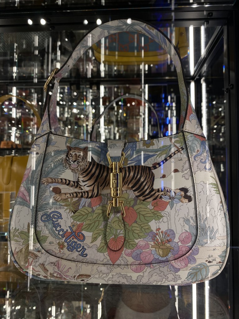 Throughout the museum, Gucci’s maximalist aesthetic is on full display. Under Alessandro Michele’s creative direction, the brand has embraced funky looks characterized by bizarre patterns, gender-neutral shapes, bright colors, and an abundance of ruffles. Modern Gucci fashion is known for its use of flora and fauna prints, incorporating motifs such as snakes, bees, flowers, tigers, and zebras into its designs, reflecting a whimsical and eclectic sensibility.