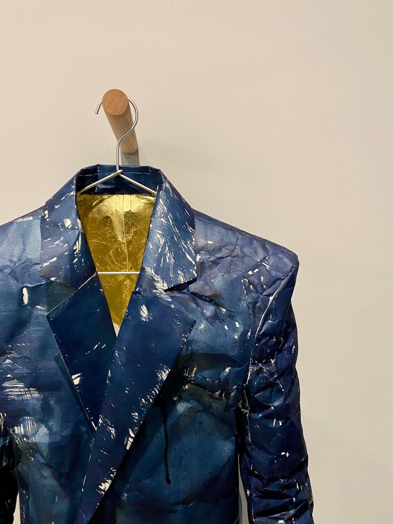 Through his work, Forde serialises scenarios, presenting them in various dimensions ranging from two to three-dimensional, often hanging compositions. These compositions include hanging paintings on linen, murals, moving images, silk, Kozo paper scrolls and expanded forms of photography. One of the notable features of Forde’s exhibition is a tailor-made paper suit, meticulously crafted to be wearable. This suit serves as a canvas for a cyanotype, a photographic printing process that captures the essence of London’s sky. Throughout the duration of the exhibition, the suit undergoes a transformation, gradually developing into a long exposure portrait of the ever-changing London firmament. This unique and dynamic artwork invites viewers to contemplate the interplay between human experience, nature, and the passage of time, while also highlighting Forde’s innovative approach to storytelling through visual art.
