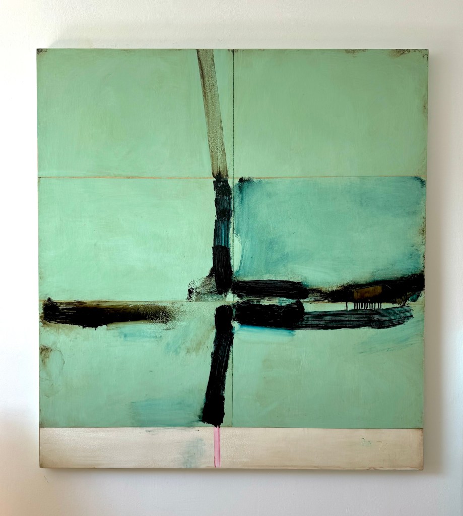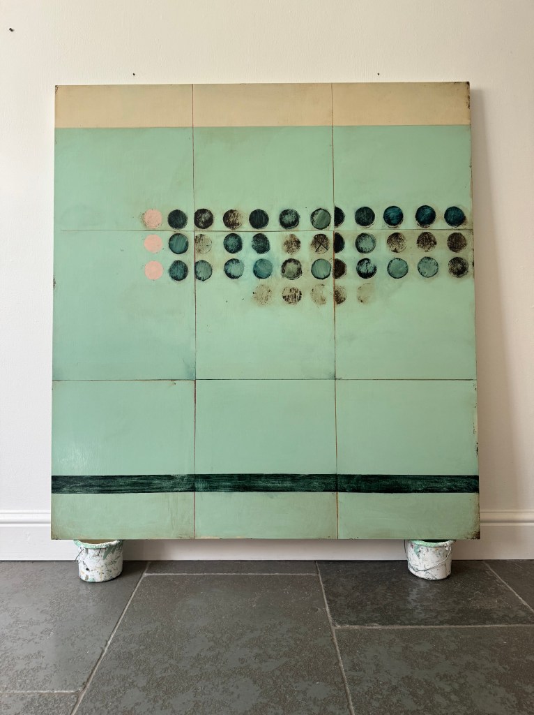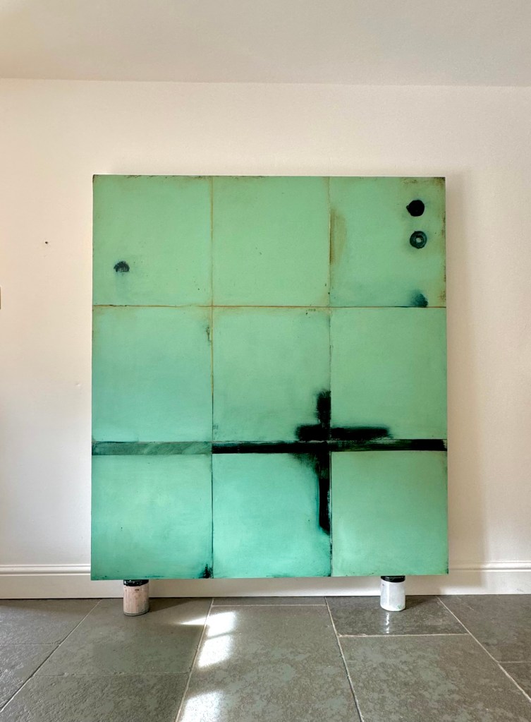 My paintings all start in the same way. I paint two layers of blue/green oil paint onto my panels thinned with linseed, galkyd and and turpentine and, once dry, the blue becomes the “ground” colour.
