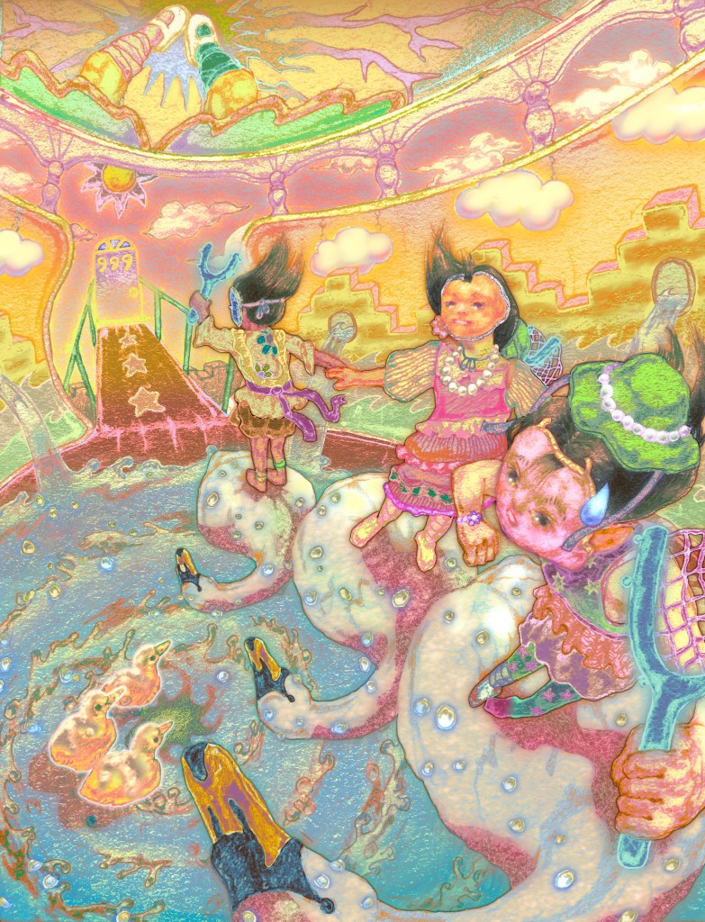 Truthfully there’s often no message in place–rather than a resolution, I think my pieces are more so about exploring and pinpointing moments of change. I tend to construct ironic narratives for the pieces I create, because I view the internal characters as anchor points that question, embrace, or oppose each other. The characters often function as projections of themselves at different points in time and evolution, however it is not as if one serves primarily as a mentor–rather, they contend with each other. I don’t believe in a right answer between maturity or so-called naivete–I think as adults, it’s easy to lose so much of the goodness that comes out of the boundlessness of the child-heart and psyche. We have restrictions and societal tenets to abide by. That being said, adulthood also grants one the potential of greater freedom, and oftentimes the ability to see more of the world, and there is beauty in growing too. There’s a tension that I like here–I don’t believe in being a child forever, but I think it’s important to intermittently revisit and care for the child-heart so as not to readily accept all the impositions and limitations of the adult world. But there is no hierarchy.