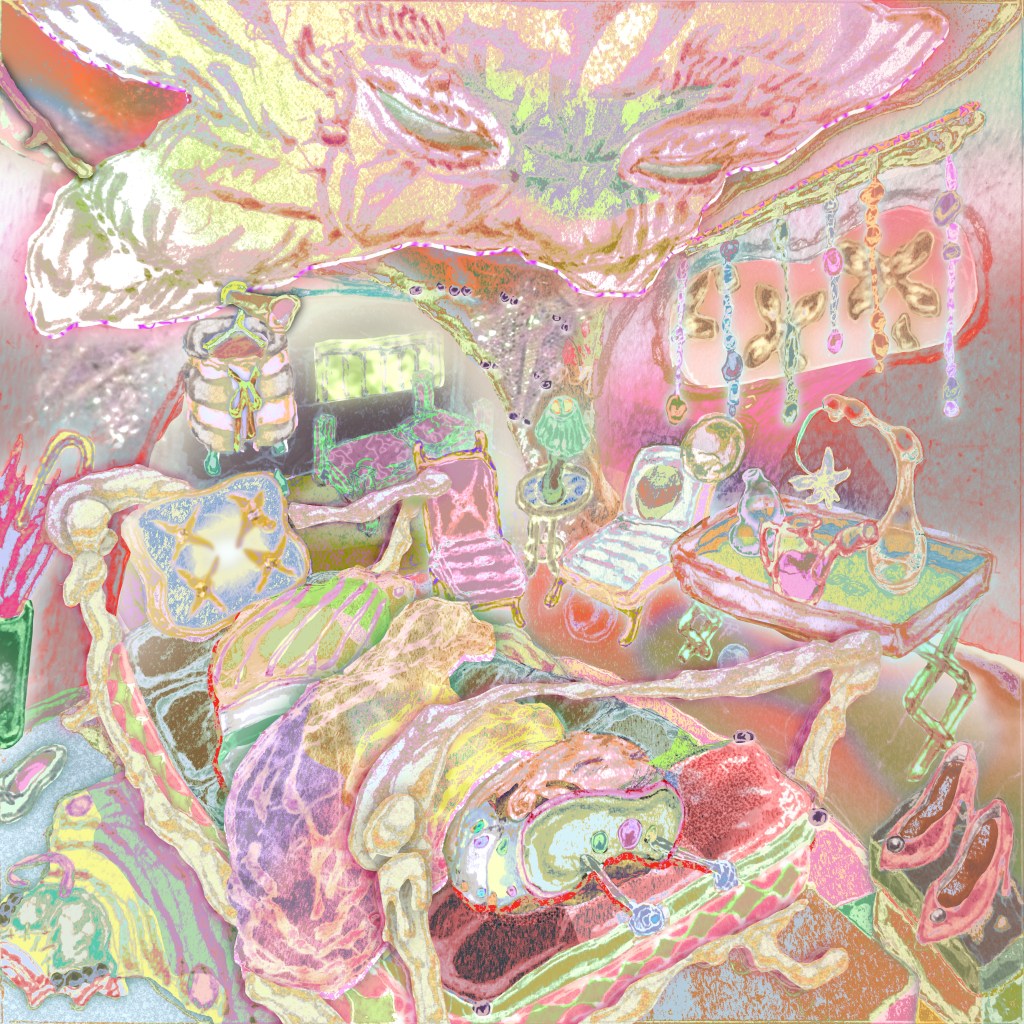 Probably a desire for experimentation–digital art was encouraged in the illustration sphere while I was in school, so I tried to emulate game art like the splash work of League of Legends despite never having played myself. Ultimately though, I felt most comfortable and most free with a pen and paper, but i enjoyed the vibrancy of color that i was now achieving on my tablet–it felt like an ode in a way to my childhood as well–I could combine the pencils that drafted shitty Woody Woodpeckers but also explore the aesthetics of the pixel art and RPGs that graced my childhood. That’s when I began bridging these things together. Now, i still like to combine these mediums but I use the digital tool more as a vehicle for deciphering color rather than an end project (exception for things that follow a digital format such as an album cover)–as much as I enjoy my digital renders, I’ve also found much joy in the textural possibility that comes with a physical piece.