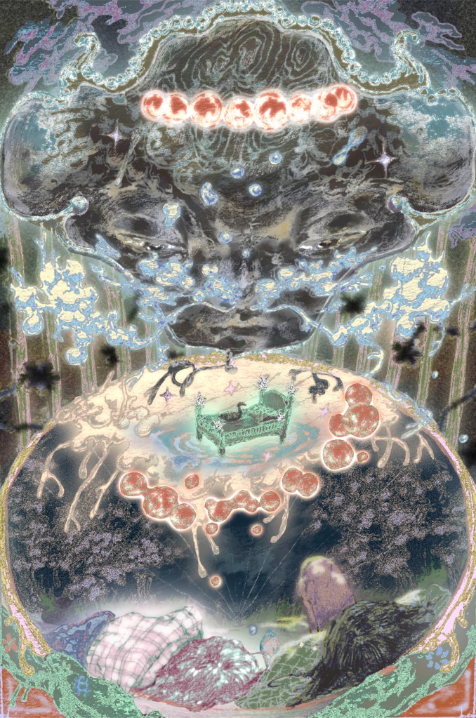 Since I’ve been shifting towards physical media more, I’m hoping to play around with physical textures, using spackles, sand, gels/epoxies, or translucent or metallic substrates to add more dimension to the work. Thematically, I’ve recently become more interested in the idea of what it means to be a sovereign body–to tread lightly and gracefully or to fall completely into trepidation.