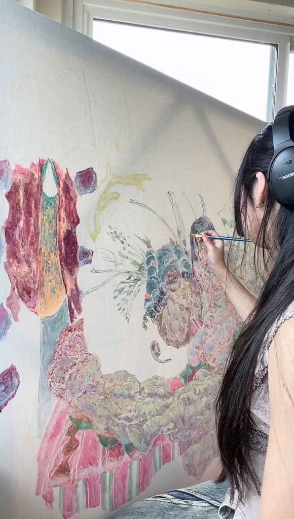 It can be hard to organize time when there’s no specific authoritative figure at your toes, so I set benchmarks for myself in my reminders app broken down into stages. For example, for my recent silkworm series, I knew that I wanted to create something that would yield around 4 pieces, and set a goal date for the conception, then the priming of each surface, and halfway and full markers for getting each piece done. Because painting on a large scale takes a long time, I also like to work on other projects simultaneously so I don’t get ‘familiarity blindness’ from looking at the same piece. I often draft ideas, or color other pieces as I’m working through a large scale painting. There will be times when I’m working on something with a more specific deadline such as an album cover too, in which I will also factor in additional time for that and maneuver my benchmarks accordingly. In terms of maintaining focus, playing music or an audiobook or podcast has been really helpful for me–more so for the brainless aspects of creating such as laying down color rather than thumbnailing. When it comes to planning the piece itself, I need total concentration–the only things I can listen to are instrumentals (recently a lot of Takashi Kokubo). In terms of maintaining creativity, I also make sure to allot myself time to go on walks, to meet friends, and to read–all of these things, while psychically fulfilling, also ultimately inspire my practice so much.