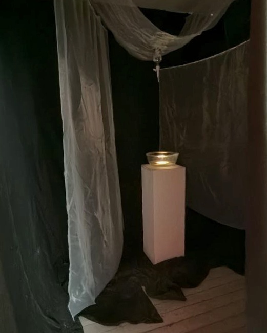 The building of the center is divided into two floors with many halls. The layout allows each hall to have its own character, with its own light, color, mood, and the weight or lightness of the objects. It is one of those instances where the theme of communication is revealed from various angles and in full, especially with the introduction of new voices in the culture. The exhibition includes video art, photography (which plays a central role), installation, painting, and—what I find particularly exciting—glass. Alexander Truskovsky, a Minsk-based artist who graduated from the BGAI Department of Monumental-Decorative Art, was given an entire hall for his works. Black walls and floor covered with shards of glass, resembling a carpet, and an artificial ceiling of torn fabric with pieces of glass suspended from it. The theatricality, spatial experience, and the viewer as part of the exhibition were central to this hall. Truskovsky was not the only artist whose glassworks were included in the exhibition. Alina Darmel, a new name, created an installation in the spirit of the NCSM (i.e., creating a spatial experience in 2m²) using glass, organza, iron, and a bowl of water. Unfortunately, the description doesn’t clarify much, but it’s very intriguing.