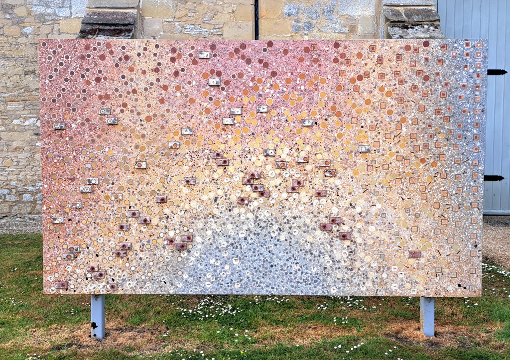 Jacob van de Beugel, a UK born Dutch artist, is a contemporary ceramicist and sculptor. His work is much sought after and can be seen in prestigious locations, including Chatsworth House and the Huis ten Bosch Palace in The Hague. Three of his works are displayed in the outdoor area immediately in front of the tithe barn. These original pieces are from Jacob’s ‘Mutation’ series, each measuring three metres wide. Much of the artist’s work takes its form from an inspirational idea relating to coding sequences in cells using methodical and subtle pattern sources with gradual colour variations. The surface inserts and textures are planned and assembled in a carefully ordered manner creating effective and beautiful effects. These bas-relief works are formed in weatherproof clay and self-healing concrete, with suitability for hanging on a flat wall. Many of Jacob’s installation works are created directly onto wall surface areas and are permanent.