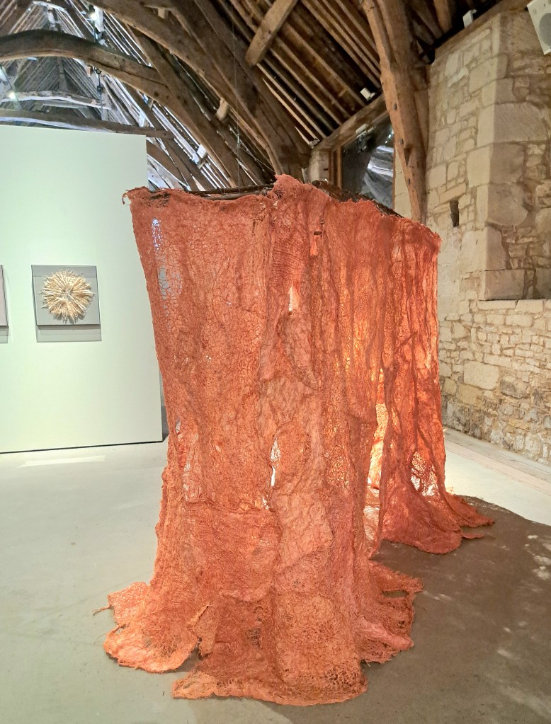 An innovator and underwater photographer, Zena Holloway is the founder of ‘Rootful’. Several large atmospheric interwoven sculptures are displayed in the tithe barn with other pieces from her ‘Sustainable Wearables Collection’. The inspiration for these works emerged from observing patterns in root formations during her underwater photographic sessions. The process of nurturing mass root growth as textile then began in her studio, using original madder root source material. ‘Sculpture in the Sands’ is a collection of large works emerging from this creative process using organic materials including beeswax and natural dyes, are bio-degradable, specifically designed to decay naturally, disappearing back into the Earth. Her empathy for land and sea environments form the basis for all works undertaken in her practice. A bio-degradable wedding dress made by the artist, was integrated into the 2024 Chelsea Flower Show. Zena’s imposing atmospheric pieces can be viewed in the tithe barn and are a testament to this original artist’s skill in conception and construction.