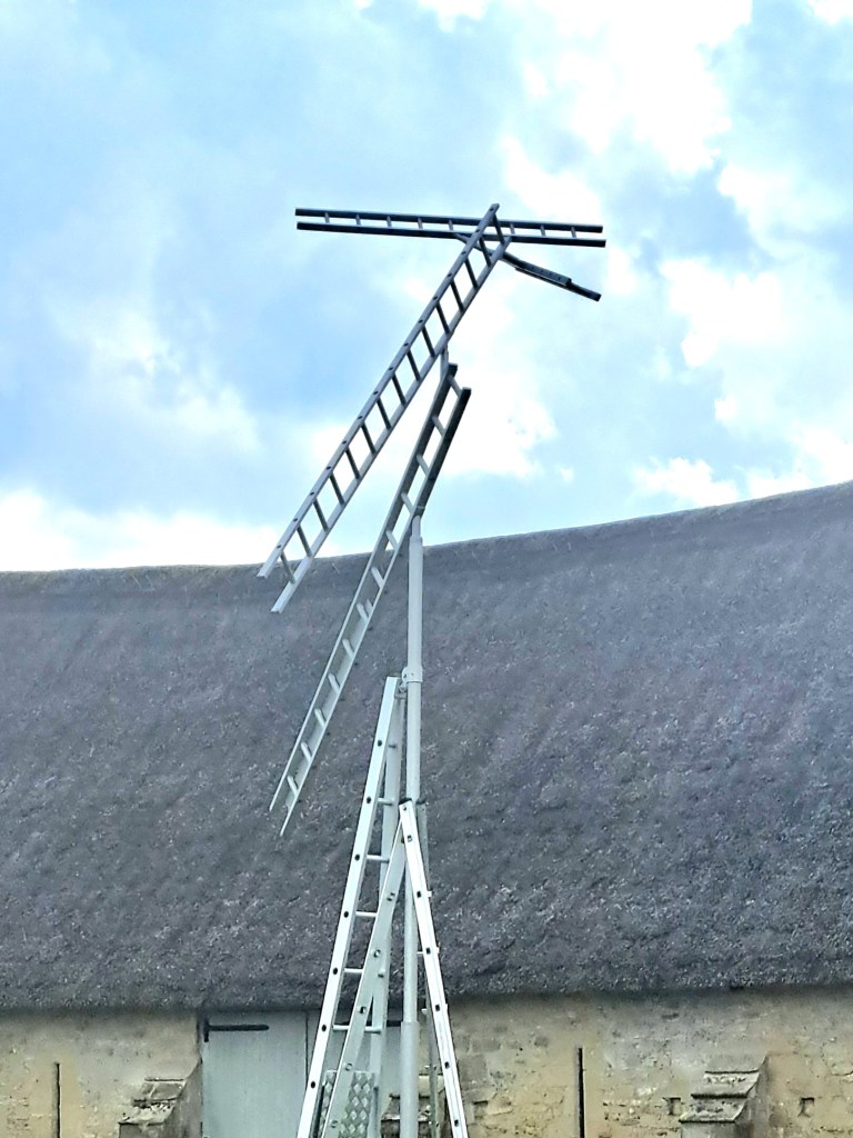 The kinetic artist Peter Logan is exhibiting a selection of free-moving and motorised sculptures, maquettes and working drawings from his life’s work. Logan’s taller balletic mechanised sculptures are arranged in the area outside the tithe barn, medium-sized and smaller pieces are displayed in the Long Gallery. The towering outdoor mobiles seem unexpectedly agile given their size and the often slim-line metalwork construction. In motion these works possess a surprising elegance of free movement and are so much more than a formula of practical engineering made from moving parts. These are cleverly crafted air-born balletic sequences providing a sophisticated sculptural experience in metal. Alexander Calder’s works used similar finite balance techniques, but these are on a different scale entirely, the bulk twisting into unexpected positions like a complex windmill where pre-planned movements are at once both irregular and consistent. To conceive and construct a work where full-scale ladders are tossed around in mid-air on a continuous loop takes a special kind of courage, and a touch of genius. The source of this inspired piece apparently came from the 12th century ladder of Divine Ascent icon in the monastery of St Catherine in Egypt. Logan has called this work ‘Tree of Heaven’ and it forms part of a series of works using this title on display in the Long Gallery.